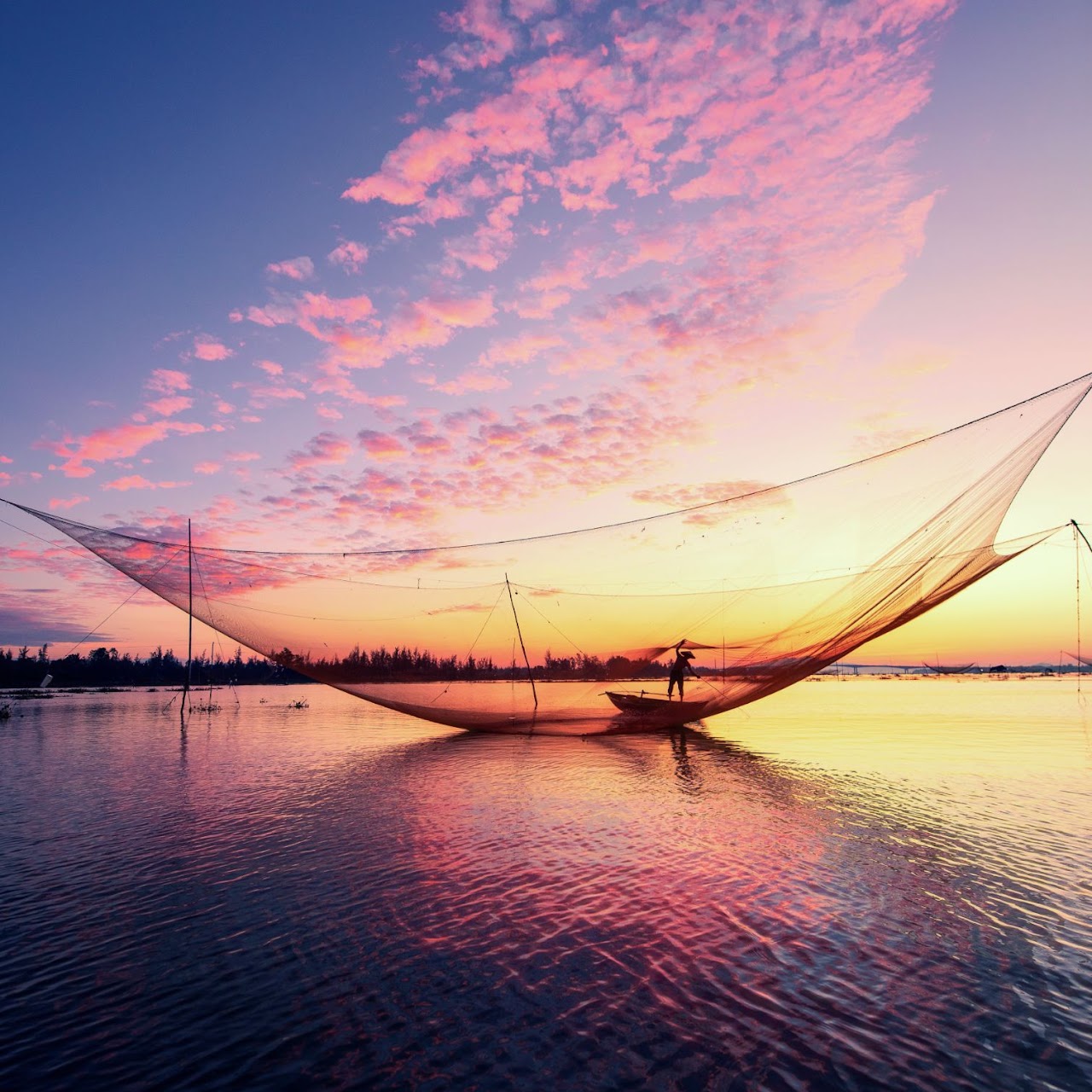 Early morning we go to Cua Dai and shoot the sunrise of big fish net with a fisherman collecting the fish from the net. Next we drive to Tra Nhieu Village to shoot the fixing blue fish net scene. Later we drive to Dien Ban hamlet to visit a lantern making house, shoot the scene of a worker making lantern.